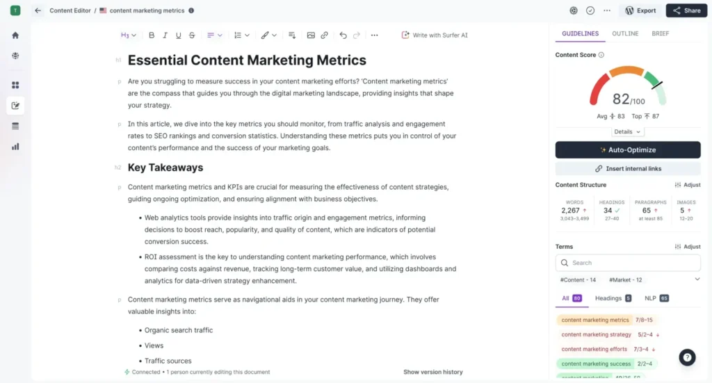 Write and optimize simultaneously with real-time metrics for structure, word count, NLP-ready keywords and images, and rank high anywhere in the world, no matter the niche or industry.